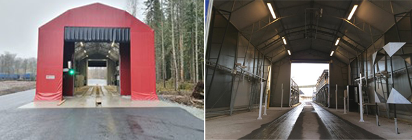 Från vänster: Infart till mäthallen med chaufförens ankomstregistrering till vänster. Höger: Insidan med kamerasystem och markörer