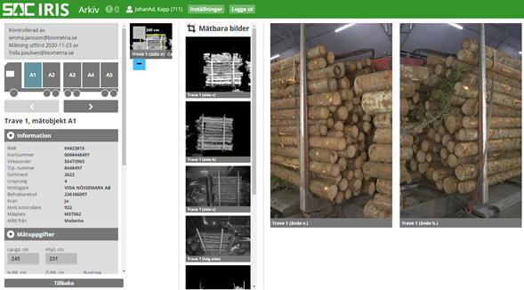 I mätplatssystemet Iris presenteras mätresultatet från Mabema, uppgifter om leveransen samt bilder på travarnas sidor och ändytor. Mätningen kompletteras med virkesmätarens kvalitetsbedömning.