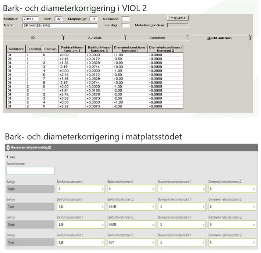 För att minska diametern med rätt barktjocklek samt för att korrigera mätramens systematiska mätfel korrigeras alla stockar med hjälp av Bark- och diameterkorrektion. För att kvantitets- och värdeberäkning ska bli så jämförbara som möjligt mellan VIOL 2 och VIOL 3 måste värden för bark- och diameterkorrektion läggas upp för den aktuella mätplatsen. Värden läggs upp för en specifik utrustning, trädslag och barktyp.