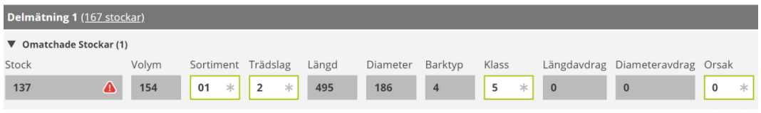 När man läser in en stockdatafil som innehåller ett värde på en egenskap som inte finns på någon produkt i det aktuella handelssortimentet hamnar stockarna på en larmlista och användaren får ett meddelande om att det finns ”omatchade stockar” (se exempel nedan). Stockdatafilen kan då inte läsas in förrän användaren rättat stockdatat och slutfört mätningen. Ev. korrigeringar kan i sig leda till skillnader i jämförelser i kvantitets- och värdeberäkning.