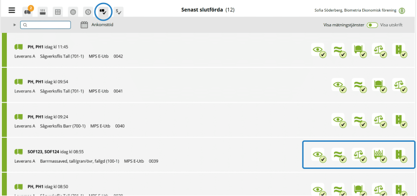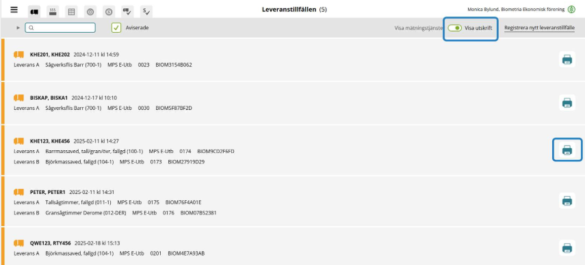 Under ikonen för skrivare får du upp samtliga kvitton som hör till leveranstillfället. Efter målflaggan har godkänts hittar du samma knapp med samtliga kvitton under fliken Slutförda leveranstillfällen.