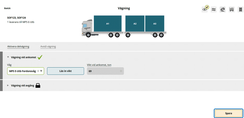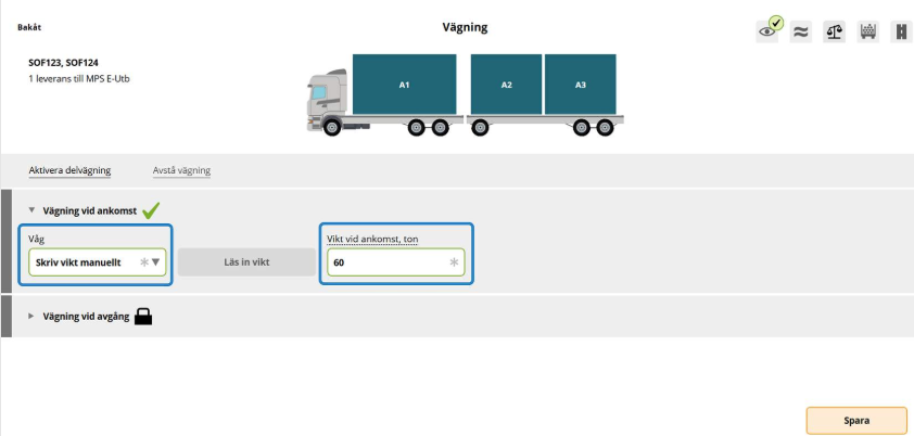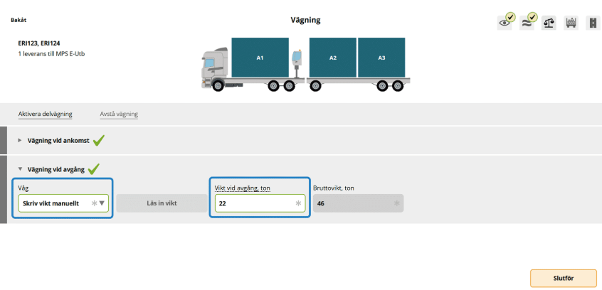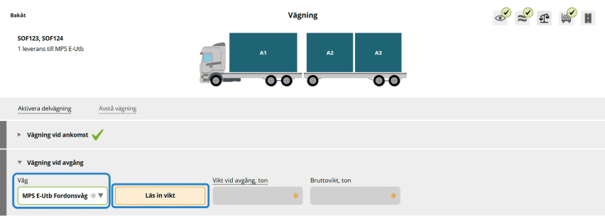 När ekipaget står på vågen ska vikten vid avgång läsas in.