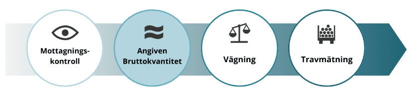 Nästa steg är att godkänna angiven bruttokvantitet. Angiven bruttokvantitet är den uppskattning av lastad volym som chauffören anger i leveransaviseringen. Den bruttokvantitet som redovisas bör motsvara den avlämnade volymen. Den är inte ersättningsgrundande utan används för lagerhantering och statistik.