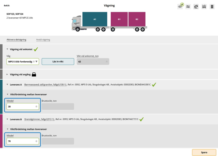 Vid avgång kan viktfördelningen mellan leveranserna korrigeras. I exemplet är viktfördelningen angiven i procent. Vikten fördelas mellan leveranserna enligt angiven viktdel.