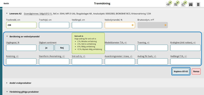 De värden som anges för en av leveranserna kan kopieras till övriga leveranser. För att kopiera beräkning av vedvolymandel till exempel till leverans A3.