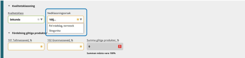 Kvalitetsklass (Prima, sekunda, utskott) och eventuell nedklassningsorsak, om kvalitetsklassning är en del av uppsatt flöde.