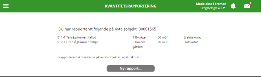Vid kvantitetsrapportering via produktionssystemets gränssnitt används de avläggsuppgifter som finns angivna på avtalsobjektet. Finns det flera avlägg upplagda på avtalsobjektet går det att välja mellan dessa avlägg vid rapporteringen. Det är avläggsnummer och klartext som visas i gränssnittet men i resultatet lagras även koordinaterna.