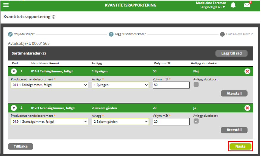 5. Välj Producerat handelssortiment, Avlägg och fyll i volym m3f. Kryssa i rutan under Avlägg slutskotat om slutsignal för avlägget ska finnas med i resultatet. Upprepa eventuellt steg 4-5 om flera rader ska rapporteras.