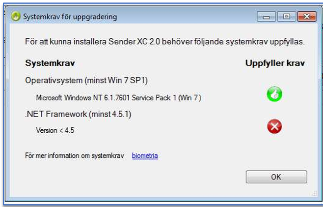 Om systemkraven ej uppfylls visas dialog som förklarar varför, i exemplet nedan är det versionen .NET Framework som är för låg. Kontakta din uppdragsgivare om en likande ruta visas.