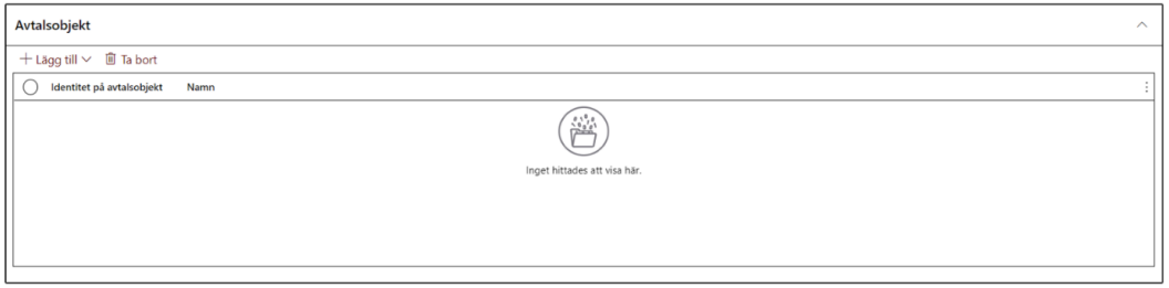 I fältet avtalsobjekt kan du se om det finns refererande avtalsobjekt till kollektivet. Syftet med fältet är att hitta rätt kollektiv för flödet vid destinering. Avtalsobjekt kan läggas till i en aktiv kollektivbeskrivning.