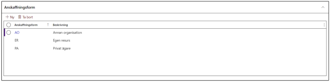 I fältet anskaffningsform anges vilka anskaffningsformer som kollektivet kan användas till. Syftet med fältet är att hitta rätt kollektiv för flödet vid destinering. Anskaffningsformer kan läggas till i en aktiv kollektivbeskrivning.