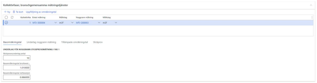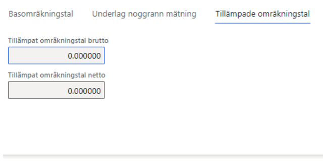 Här visas vilka omräkningstal som tillämpas för att räkna om inmätta¨kvantiteter. Efter aktivering av kollektivbeskrivningen är det basomräkningstalen som visas. I takt med att prov inkommer ersätts dessa med omräkningstal utifrån verkliga stickprov.
