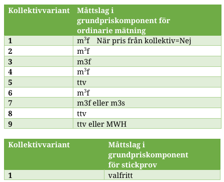 För kollektivvariant 5 och 7 måste en prislista eller komponent i kontraktet finnas. Sågverksflis har grundpriset uttryckt i samma prislista som gäller för premier och avdrag.