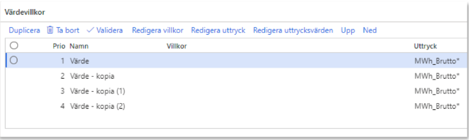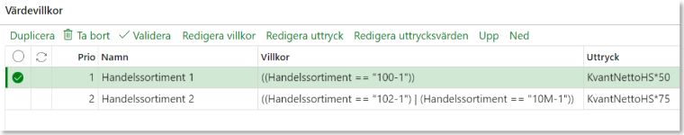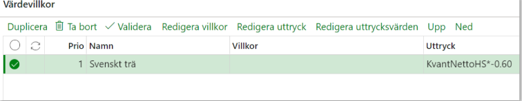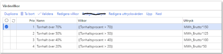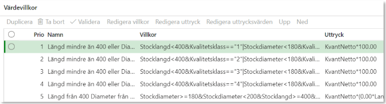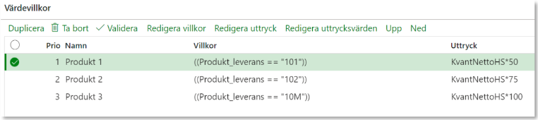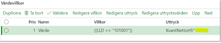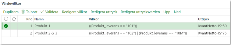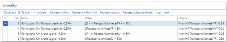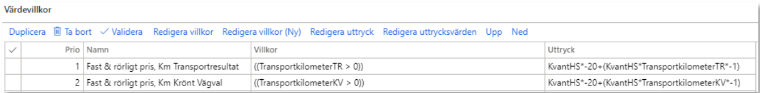 Värdevillkor består av prio, namn, villkor och uttryck. Under villkor anges villkoret som behöver uppfyllas för att beräkna uttrycket. Uttrycket består av en