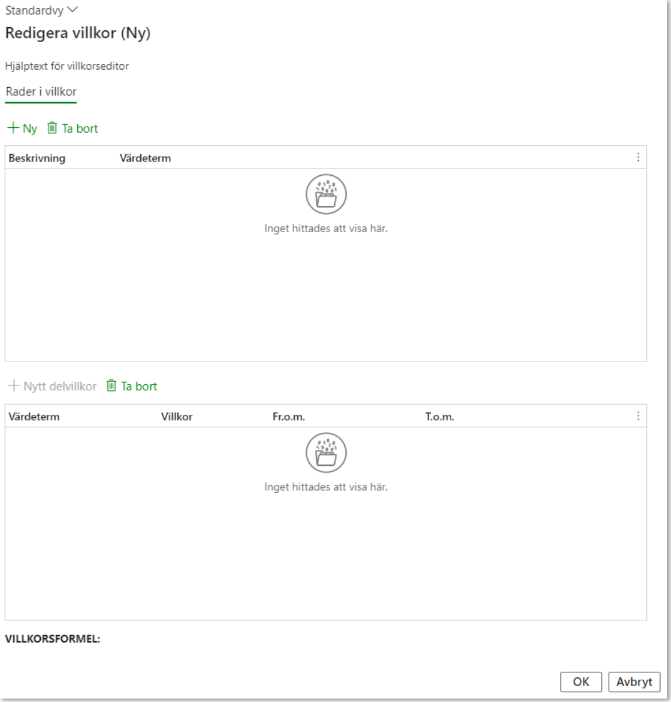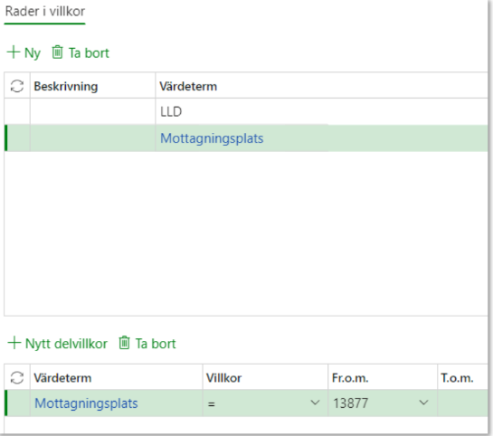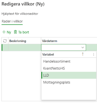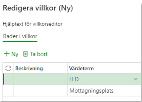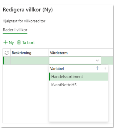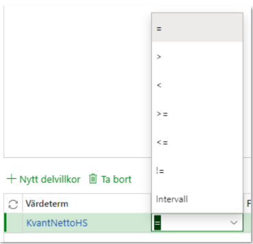 När en värdeterm valts in i Rader i villkor är det möjligt att skapa ett nytt delvillkor.