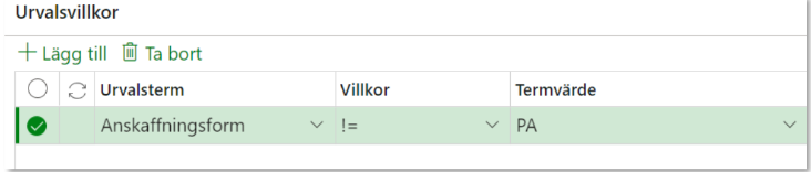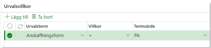 Nytt urvalsvillkor skapas med knappen Lägg till.