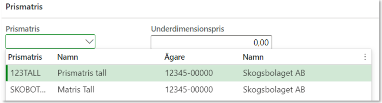 Pris råvara > Matriser och längdkorrektioner > Prismatriser