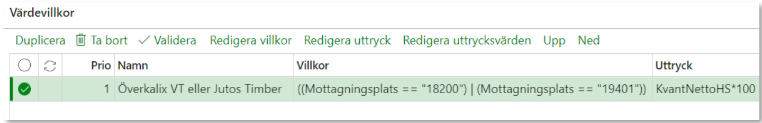 Detta värdevillkor innebär att värdeberäkningen beräknar ett tillägg med 100kr/m3f om mottagningsplatsen är lika med Överkalix VT (18200) ELLER lika med Jutos Timber (19401). Om mottagningsplatsen är varken eller sker ingen värdeberäkning med priskomponenten.