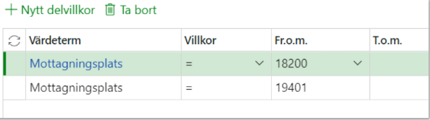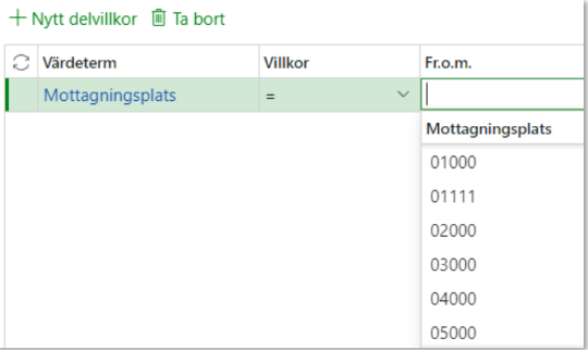Markera nästa värdeterm (Mottagningsplats) för att skapa ett ytterligare delvillkor: