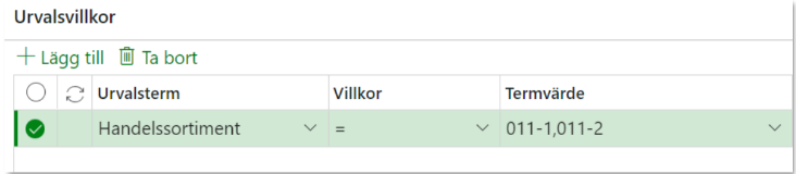 Detta urvalsvillkor innefattar flera termvärden och innebär att värdeberäkningen läser priskomponentens värdevillkor om Handelssortimentet är lika med 011-1 eller lika med 011-2.