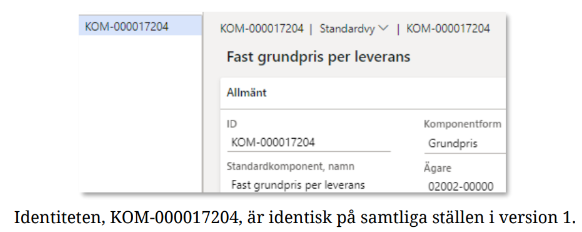 Identiteten, KOM-000021051, tilldelas automatiskt av systemet. När priskomponenten aktiveras, förändras versionsidentiteten. Identiteten förändras ej när versionshantering sker och nya versioner av priskomponenten skapas.