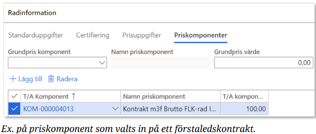 Skapas och redigeras i priskomponentförteckningen och väljs in på kontrakt (rad eller huvud). Detta sker antingen via klienten eller via integration. Värde kan ej anges utan det hämtas från den aktiva priskomponenten i priskomponentförteckningen. Värdet skrivs inte ut i kontraktet, se bild nedan.