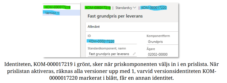 När priskomponenten lyfts in i ett kontrakt, har den samma identitet som i priskomponentformuläret. Detta eftersom priskomponenten är unik i sin förekomst i priskomponentformuläret, ej i aktuellt kontrakt. Varje gång priskomponenten versionshanteras sker förändringen i samtliga kontrakt där priskomponenten finns invald.