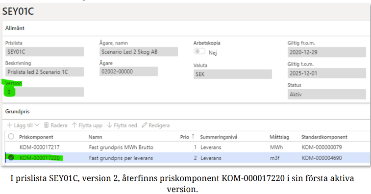 Versionshantering av en priskomponent som används i prislista, kan endast ske från en prislista. Ej från priskomponentformuläret. Detta eftersom priskomponenten är unik i sin förekomst i aktuell prislista.