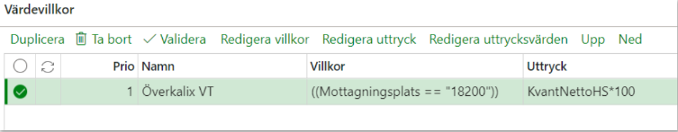 Detta värdevillkor innebär att värdeberäkningen beräknar ett tillägg med 100kr/m3f om mottagningsplatsen är lika med Överkalix VT (18200) och 150kr/m3f om mottagningsplatsen är lika med Jutos Timber (19401). Om mottagningsplatsen är varken eller sker ingen värdeberäkning med priskomponenten.
