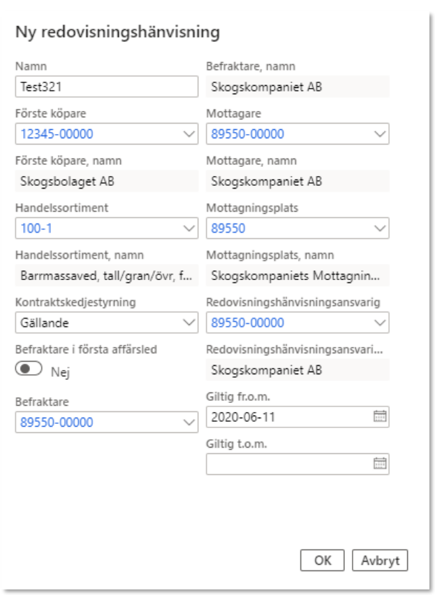 Du har nu skapat en redovisningshänvisning och kan därmed destinera det aktuella handelssortimentet i ditt avtalsobjekt. Observera däremot att verifieringen av huruvida redovisningshänvisningen kan användas för mätbeodring (att det exempelvis finns mätningstjänster) sker inte när redovisningshänvisningen sparas, utan sker först när du verifierar din destinering i ditt förstaledskontrakt.