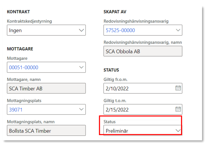15. Under rubriken Detaljer så får du en överblick över din nya redovisningshänvisning. Vid status Preliminär så kan du fortfarande förändra samtliga fält.
