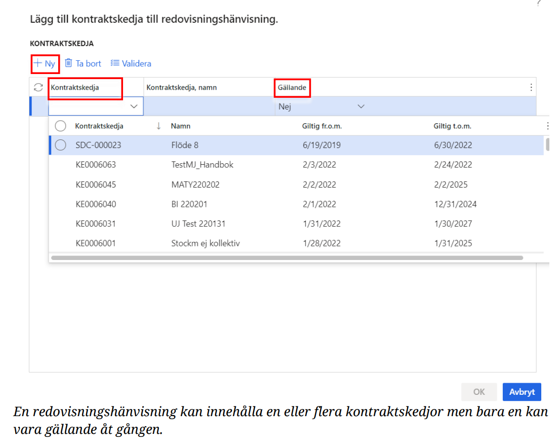 20. Välj de kontraktskedjor som redovisningshänvisningen ska innehålla. Filtrera antingen via det unika kontraktskedjeidentiteten eller vid namn.
