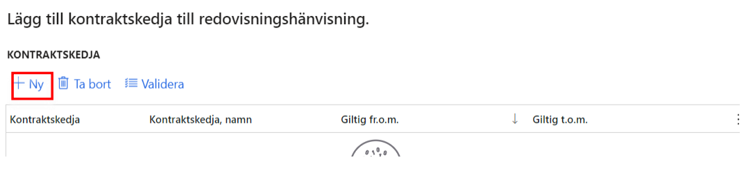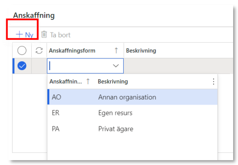 Välj anskaffningsform genom att klicka på Ny (tänk på att anskaffningsformen måste vara densamma i förstaledskontraktet som redovisningshänvisningen). Det är möjligt att ange flera anskaffningsformer.