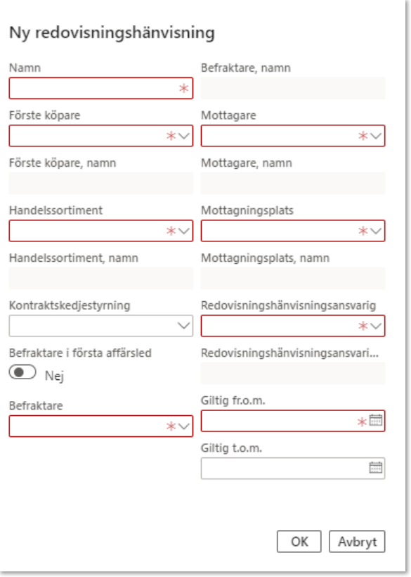 En redovisningshänvisning måste finnas per handelssortiment/mottagare/förste köpare. Detta medför att redovisningshänvisningar är stabila över tid, och behöver bara skapas i följande fall: