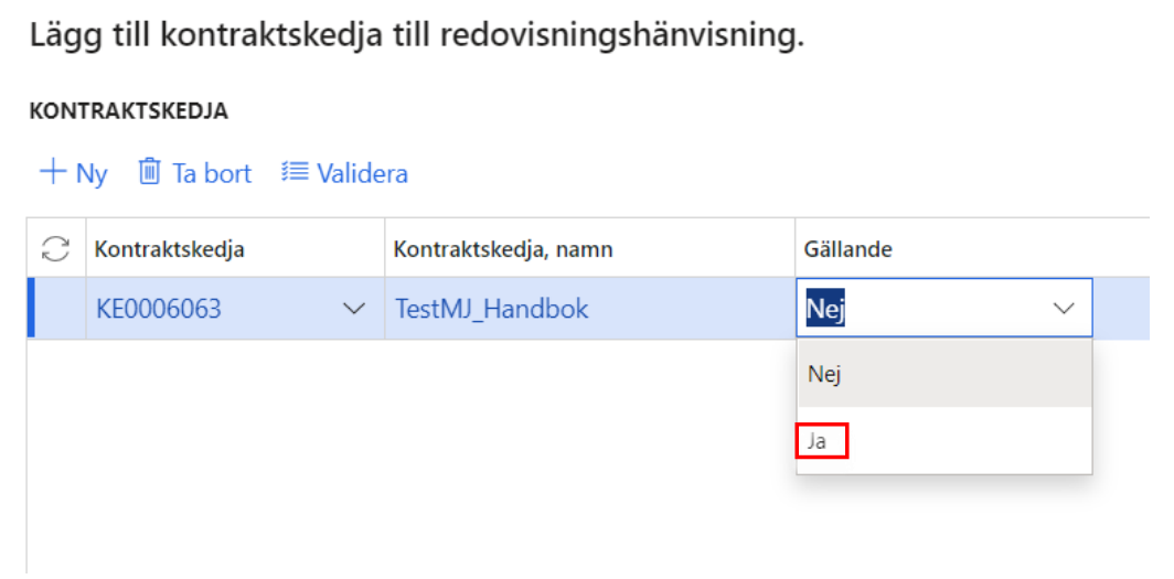 - Gällande. Du anger en eller flera kontraktskedjor och anger vilken av de valda kontraktskedjor som ska användas i redovisningshänvisningen. Detta medför att du måste manuellt växla mellan kontraktskedjor.