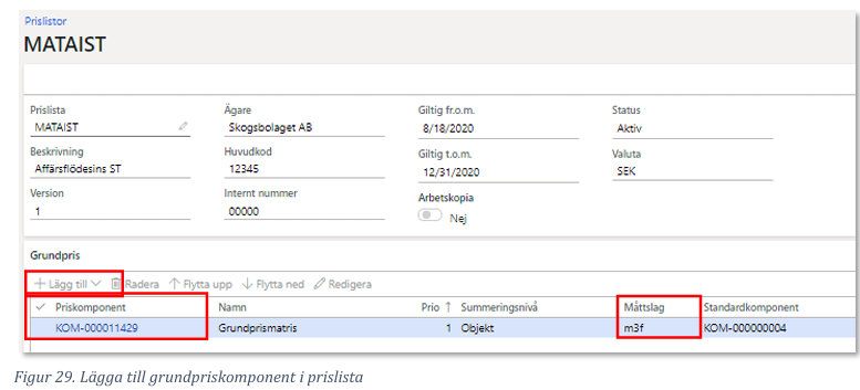 I prislistan ska en grundpriskomponent eller grundprismatris läggas till. För mer information om hur man skapar en prislista och priskomponenter, se materialet under Användardokumentation och kategorin Redovisning.