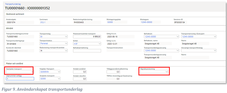 - För att möjliggöra prisräkning måste transportunderlaget vara användarskapat. Det görs genom att kopiera det systemskapade. Startplats, viaplats och slutplats ska också anges i Transportunderlaget.