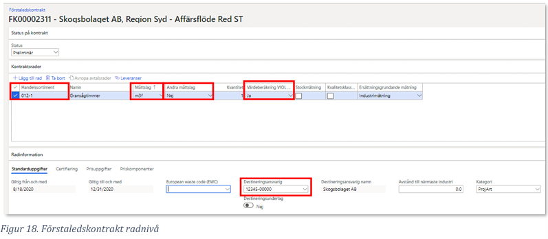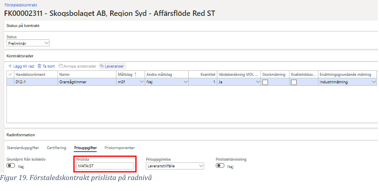 Handelssortimentet 012-1 (gransågtimmer) läggs till som en kontraktsrad och måttslag sätts till m3f. Det är viktigt att man väljer rätt måttslag för att destineringen ska fungera. Viktigt att tänka på är att flikarna måttslag och andra måttslag påverkar även vilket måttslag som grundpriset som kommer användas i prisräkning.