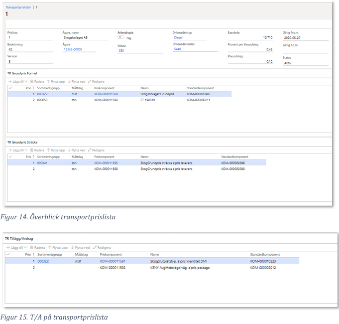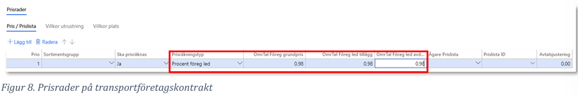 Prisraderna på transportföretagskontraktet används på samma sätt som i befraktarkontraktet. En skillnad från befraktarkontraktet gör det möjligt att värdeberäkna med pris från föregående led. Detta väljs under prisräkningstyp.