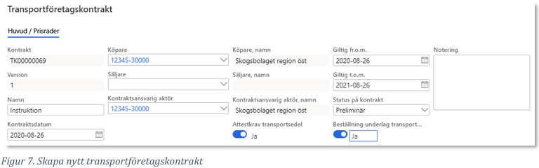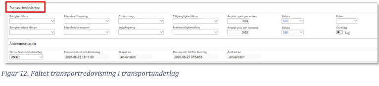 - Alla uppgifter utom ”Avtalat pris per enhet” och ”Avtalat pris per leverans” har sitt ursprung från avläggets uppgifter i förstaledskontraktet. Om uppgifter läggs till i transportunderlaget förs dessa automatiskt över till transportinstruktionen.