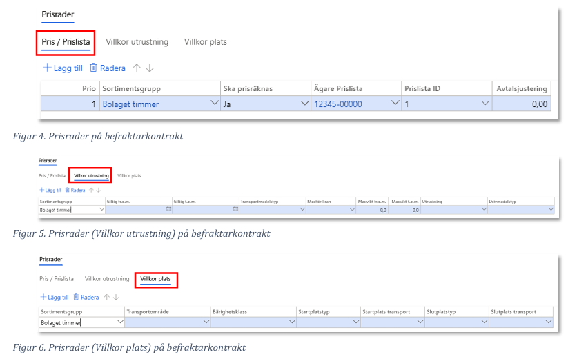 - Likt befraktarkontrakt är det möjligt att styra pris baserat på sortimentsgrupp, villkorutrustning och villkor plats.
