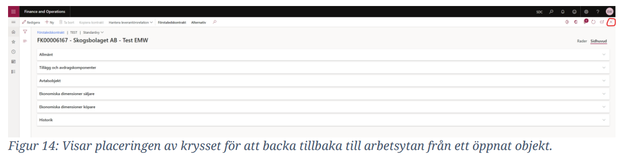 Om du har använt en av länkarna i arbetsytan, antingen de listade under Genvägar eller om du klickat på en länk i listvyn så är det snabbaste sättet tillbaka till arbetsytan att klicka på krysset som du hittar längst till höger i verktygsfältet. Detta fungerar även om du utgått från Ny-knappen och skapat upp ett nytt objekt. Notera att om du efter att ha lämnat arbetsytan klickat dig vidare många gånger, exempelvis om du gått till en prislista och därifrån till en priskomponent eller dylikt, så kan du behöva klicka på krysset mer än en gång och då kan det i vissa fall vara smidigare att använda menyn eller startsidan för att navigera tillbaka till arbetsytan.
