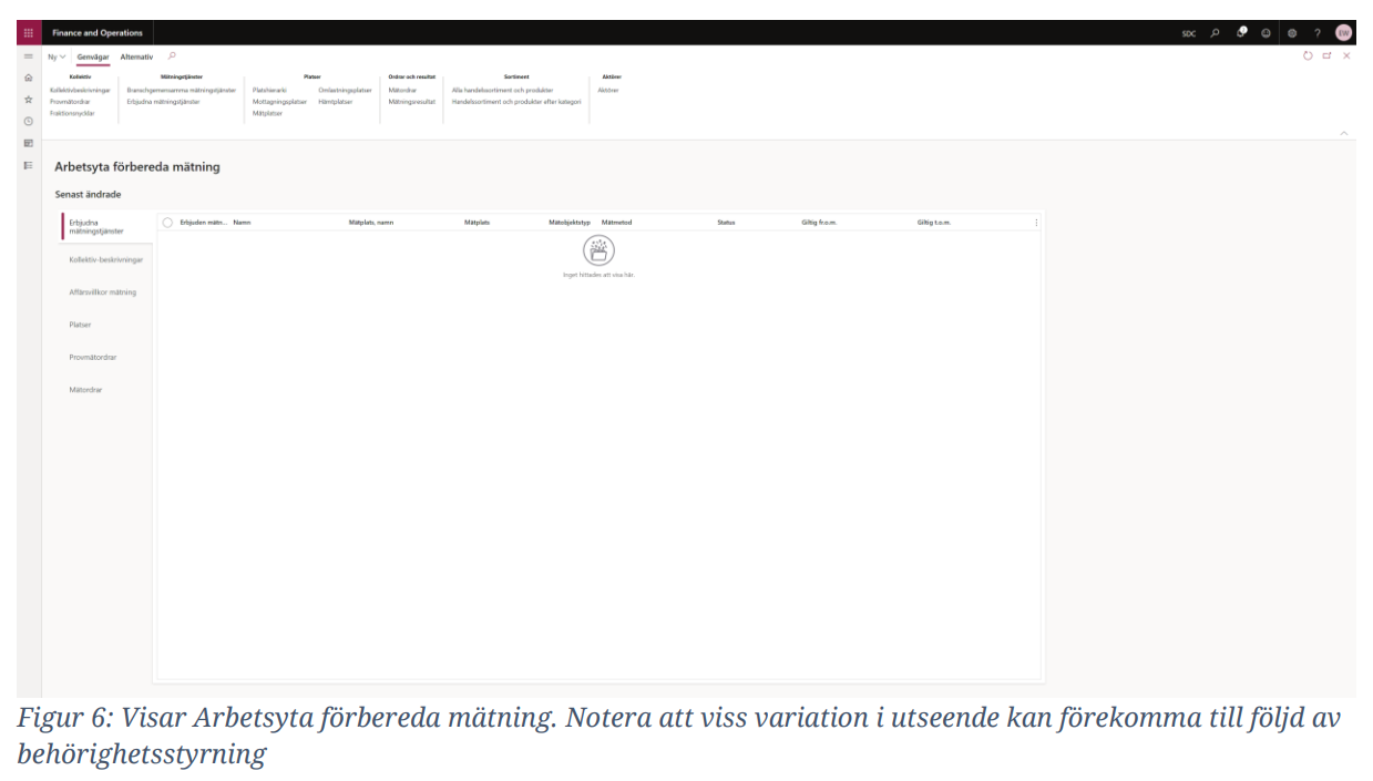 Arbetsyta förbereda mätning är till för de användare som innehar rollen som mätande företag. Denna yta har inga notiser utan består endast av en listvy med flikar och verktygsfältet med dess Ny-knapp och knappen Genvägar. Från arbetsytan ska det gå att skapa upp följande objekt från Ny-knappen:
