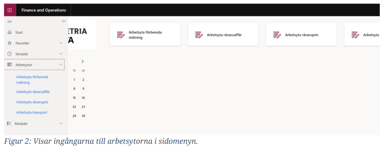 Det finns fyra arbetsytor som Biometria tagit fram åt er kunder; Arbetsyta förbereda mätning, Arbetsyta råvaruaffär, Arbetsyta råvarupris och Arbetsyta transport. Notera att dessa arbetsytor endast förekommer i affärssystemet.