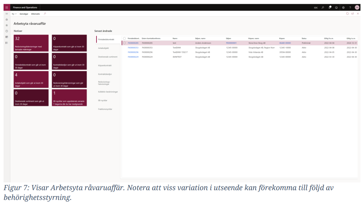 Arbetsyta råvaruaffär är till för de användare som arbetar med kontrakt och dylikt för råvaruaffären. Denna yta har notiser, listvy och verktygsfält. Från arbetsytan är det möjligt att skapa upp följande objekt från Ny-knappen: