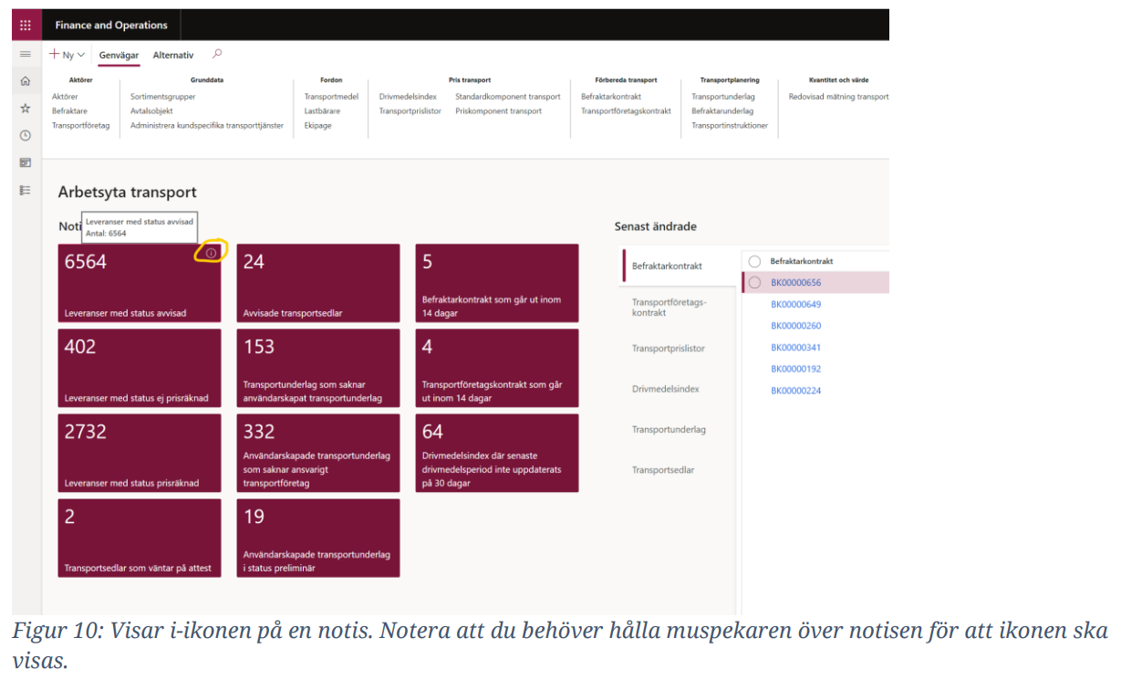 I notis-delen av arbetsytan visas olika notiser som påkallar användarens uppmärksamhet. Syftet med notiserna är att uppmärksamma dig som användare på förändringar som sker i/med objekten såväl som informera om vilka objekt som kräver åtgärd. För att se de exakta objekt som notisen larmar för så klickar du bara på notisen så tas du till en bakomliggande lista över objekten. Utifrån den information som visas i den bakomliggande listan kan du sedan fatta beslut om eventuella åtgärder som krävs. Vilka notiser som finns och huruvida de faktiskt kräver att användaren vidtar en åtgärd varierar från arbetsyta till arbetsyta. Notiserna uppdateras ca var 10:e minut, men det går även att uppdatera dem manuellt (se kapitel Tips och Trix).