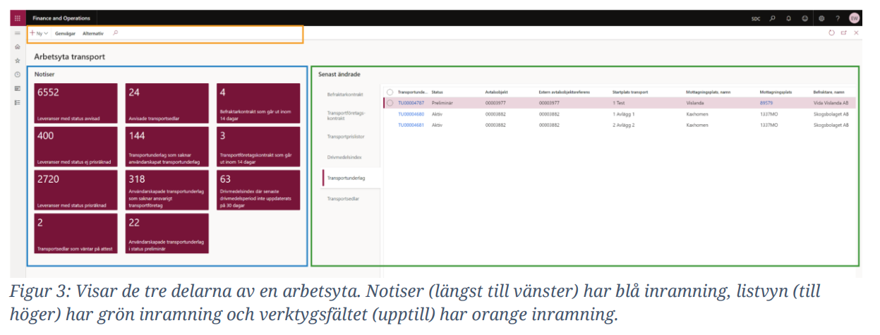Arbetsyta transport är till för de användare som arbetar med kontrakt, underlag och pris för transport. Denna yta har notiser, listvy och verktygsfält. Från arbetsytan är det möjligt att skapa upp följande objekt från Ny-knappen:
