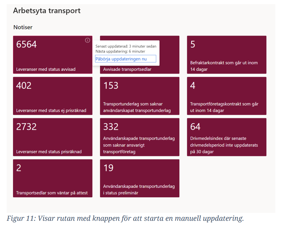 På varje notis finns det en liten i-ikon. Klicka på den för att få upp en ruta innehållandes alternativet Påbörja uppdateringen nu som du sedan klickar på. I rutan visas även när den senaste uppdateringen gjordes för just den notisen. Notera att detta sätt att uppdatera endast uppdaterar den enskilda notisen och inte samtliga på den arbetsyta du befinner dig på. Vill du uppdatera samtliga notiser på en gång krävs omladdning av sidan eller att du klickar på uppdateringssymbolen till höger i verktygsfältet.