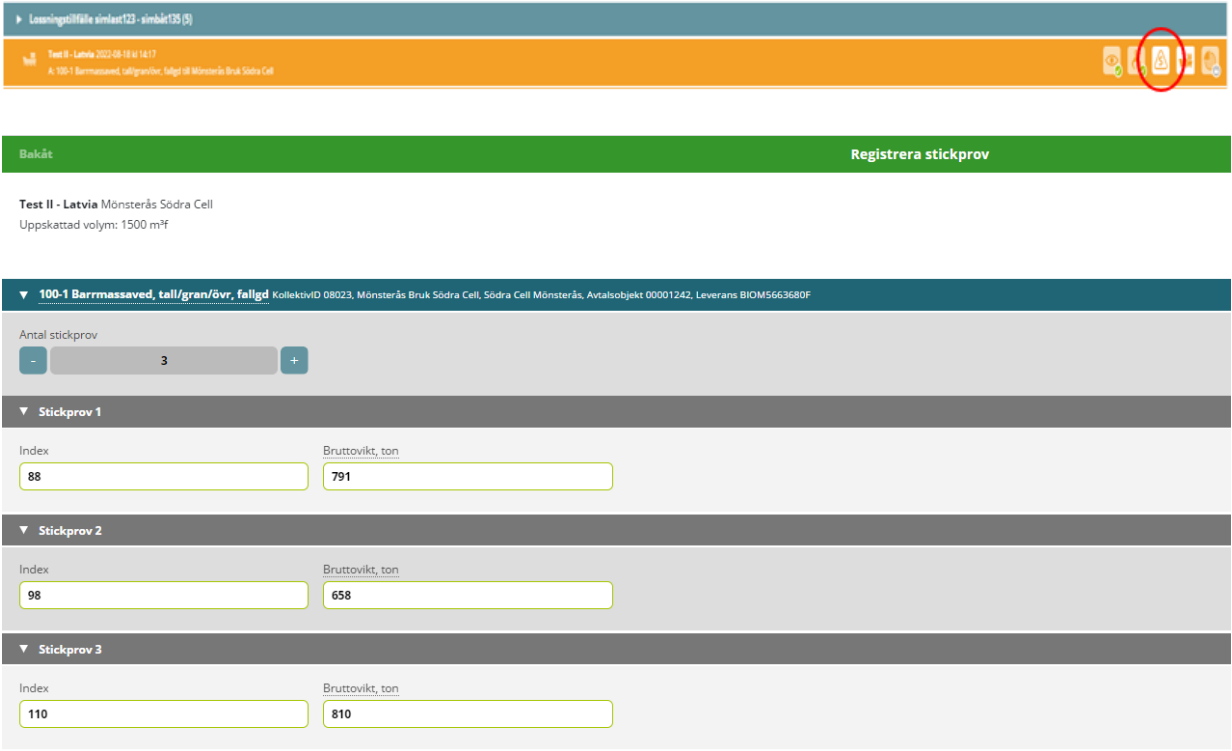 - När samtliga leveranser i lossningstillfället är mätt och registrerad ska stickproverna registreras.