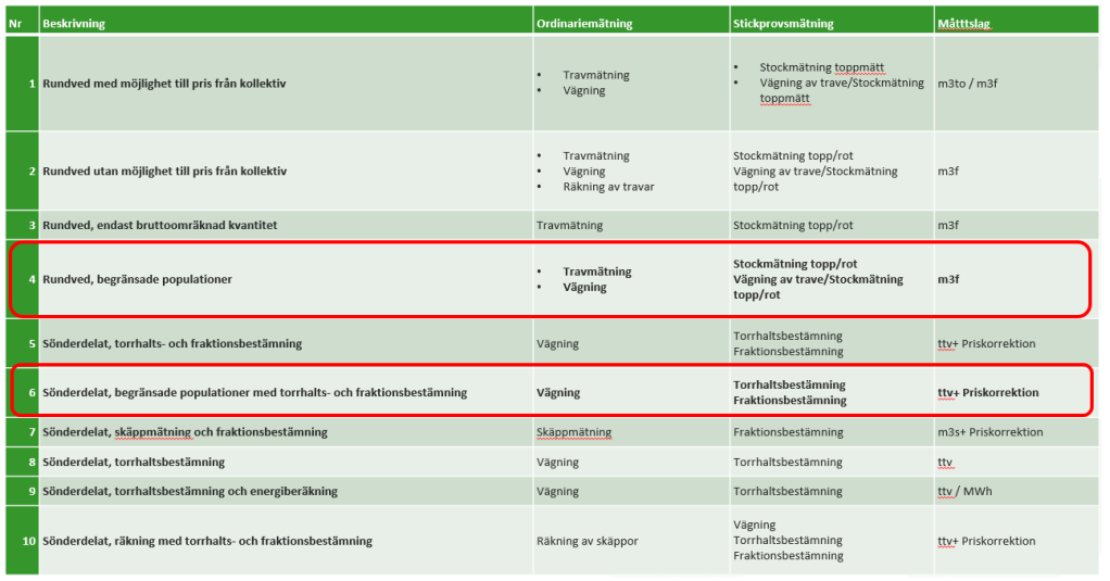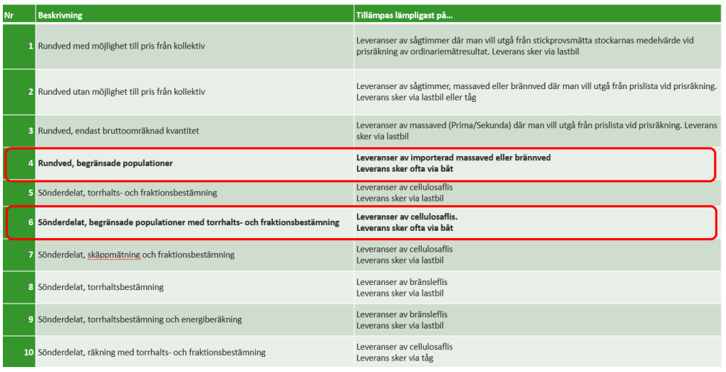 - Kollektivvariant 6 används för stickprovsmätning och redovisning av sönderdelade sortiment (Cellulosaflis, Skogsflis etc.)